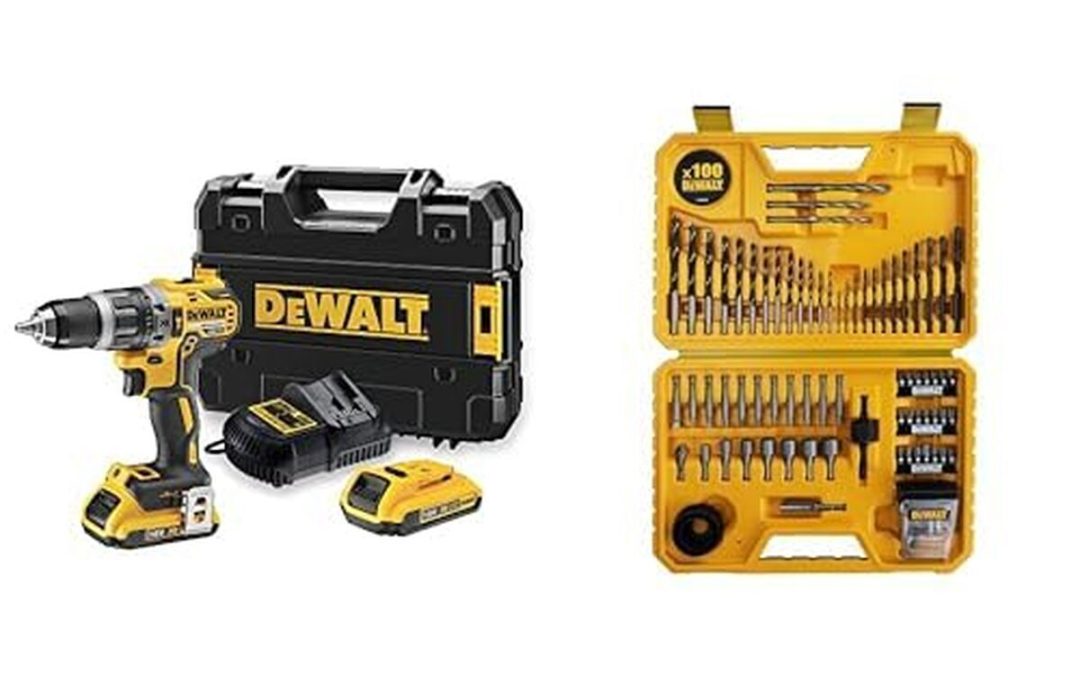 DEWALT - Perceuse Visseuse à Percussion Brushless XR 18V Li-Ion 2Ah - Perceuse sans Fil avec Coffret TSTAK, Éclairage LED - 420W & Coffret de 100 Pièces de Perçage et Vissage Haute Performanceproduit 1: Profitez du moteur puissant sans charbon de 420W qui garantit une meilleure autonomie et d'excellentes performances : notre perceuse polyvalente à 2 vitesses (0-550/2000 tr/min) dispose de 15 réglages pour de nombreuses applications produit 1: Perceuse robuste et ergonomique conçue pour le perçage de matériaux résistants : avec une longueur de seulement 173mm et un couple allant jusqu'à 70Nm, c'est une perceuse à percussion compacte avec éclairage LED conçue pour un usage intensif dans des espaces confinés. Elle permet de percer jusqu'à 40mm dans le bois et 13mm dans le métal et la maçonnerie produit 1: Découvrez cet outil professionnel pour un travail extrême avec les accessoires inclus : notre perceuse visseuse sans fil est vendue avec 2 batteries XR 18V 2Ah avec indicateur de charge, un chargeur multi-voltages, un coffret TSTAK, un porte-embout magnétique et un clip ceinture produit 1: Avec plus de 140 outils compatibles, la gamme DEWALT XR 18V est la gamme incontournable de la marque. Conçue pour toutes les applications, la plateforme XR 18V est large et polyvalente : sa batterie est compatible avec toujours plus d'outils, des marteaux perforateurs aux scies circulaires en passant par les tailles haies et bien plus encore ! La gamme couvre tous les besoins produit 2: Profitez de notre coffret de perçage et de vissage de 100 pièces. Notre assortiment d’accessoires de perçage et de vissage est polyvalent et répond à toutes vos attentes sur chantiers. Les accessoires sont utilisables avec nos outils et garantissent haute performance et fiabilité produit 2: Tous les accessoires dont vous avez besoin : ce coffret est composé d’embouts différents pour répondre aux divers besoins de votre chantier. Il contient 100 accessoires de perçage et de vissage pour vos demandes de bricolage au quotidien. produit 2: Composition polyvalente : 13 mèches à bois de 3 à 8mm, 12 forets métal entre 1,5 et 6,5mm, 3 forets béton entre 6 et 8mm, 2 scies cloches de 32,44mm, 1 foret porte scie cloche, 7 douilles hexagonales entre 5 et 13mm, 1 fraise à métaux, 1 porte-embout magnétique, 11 embouts de 50mm cruciformes et plats ainsi que 49 embouts de 25mm cruciformes, plats, tx, hexagonaux produit 2: Pratique et robuste : notre set de perçage et de vissage est livré dans un coffret robuste. Chaque embout y trouve sa place et ne bouge pas pendant le transport. Rangement prêt à l’utilisation et gain de temps pour trouver le bon accessoire223,19 €215,39 €-3%
